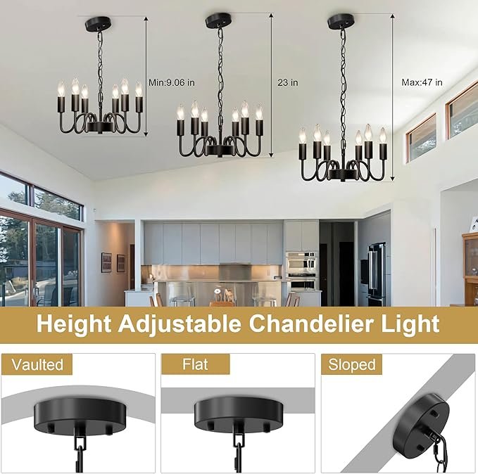 - Chandeliers with Adjustable Height: The black dining room chandelier is equipped with a flexible rope, allowing you to tailor the length according to your needs, ranging from 9.06 inches to 47 inches. It is suitable for rooms with both high and low ceilings and can also be installed on inclined ceilings. Adjusting the height is a simple process accomplished by adjusting the length of the rope.