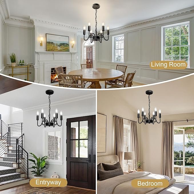 - Black Chandelier with E12 Socket: This dining room light fixture features an E12 socket, allowing compatibility with incandescent, LED, CFL, and halogen bulbs (maximum 60W). When paired with a dimmable bulb and a compatible dimmer switch, this chandelier for the bedroom can be fully adjusted to varying brightness levels, granting you the freedom to select your desired color temperature and create the ambiance for any occasion. (Please note: bulb and dimmer switch are not included)