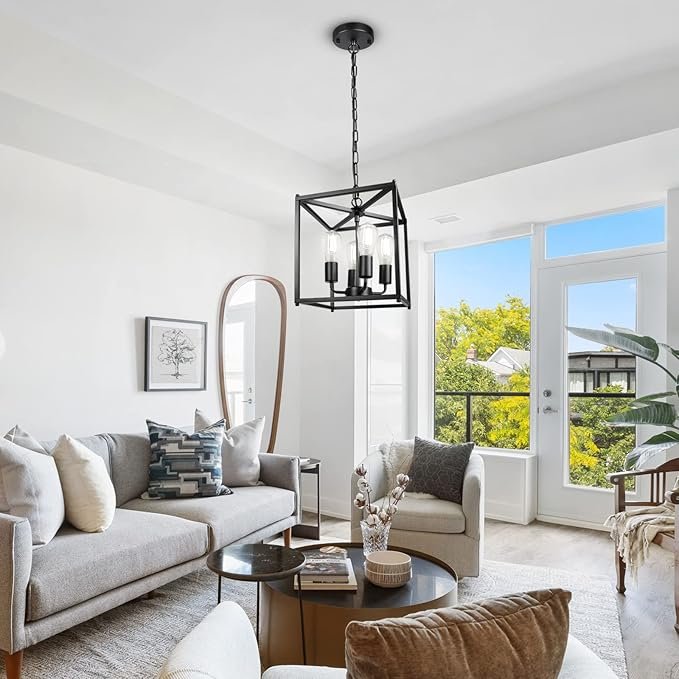 Unicozin 4-Light Black Farmhouse Chandelier, Iron Lantern Pendant Light Rustic Cage Adjustable Height, E26 Base Industrial Hanging Lights for Kitchen Island Dining Room Hallway Foyer Entryway